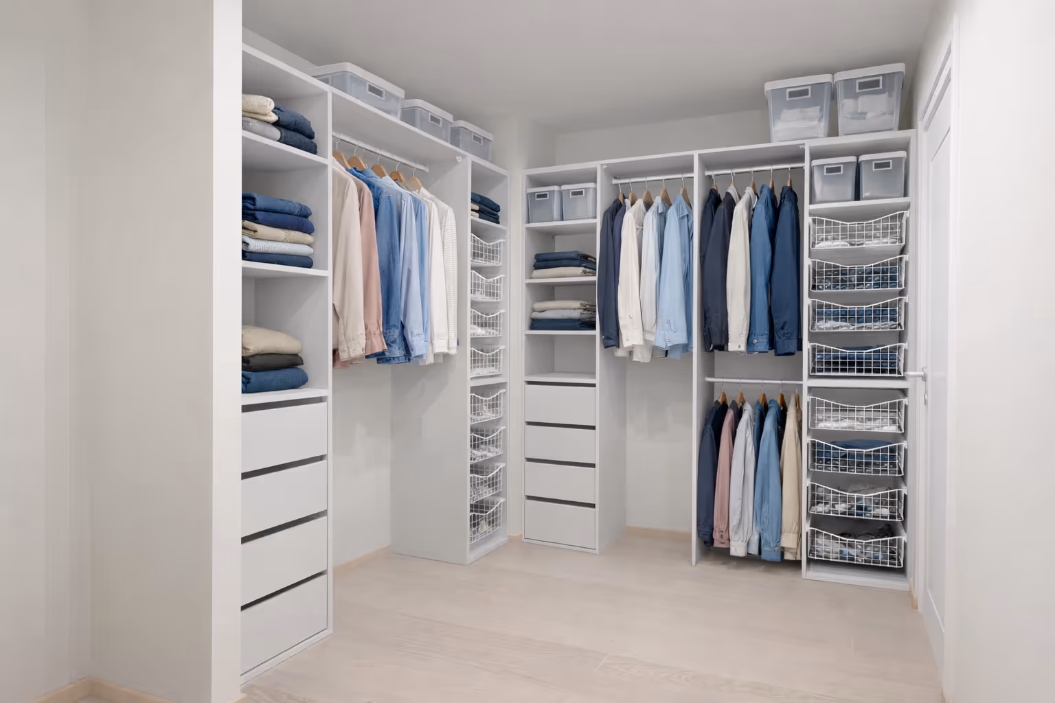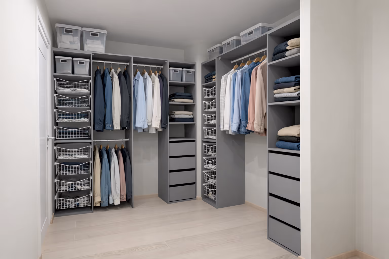 Basic garderoben bygger på standard seksjoner som er satt sammen for å gjøre garderobe planlegging både enkel og fleksibel. Serien gir gode muligheter for å kombinere hyller, skuffer, kurver og heng etter behov. Du kan velge blant ferdige innredningspakker eller sette sammen din egen løsning, alt etter hvor mye oppbevaring du trenger og hvordan du ønsker å organisere innholdet.
