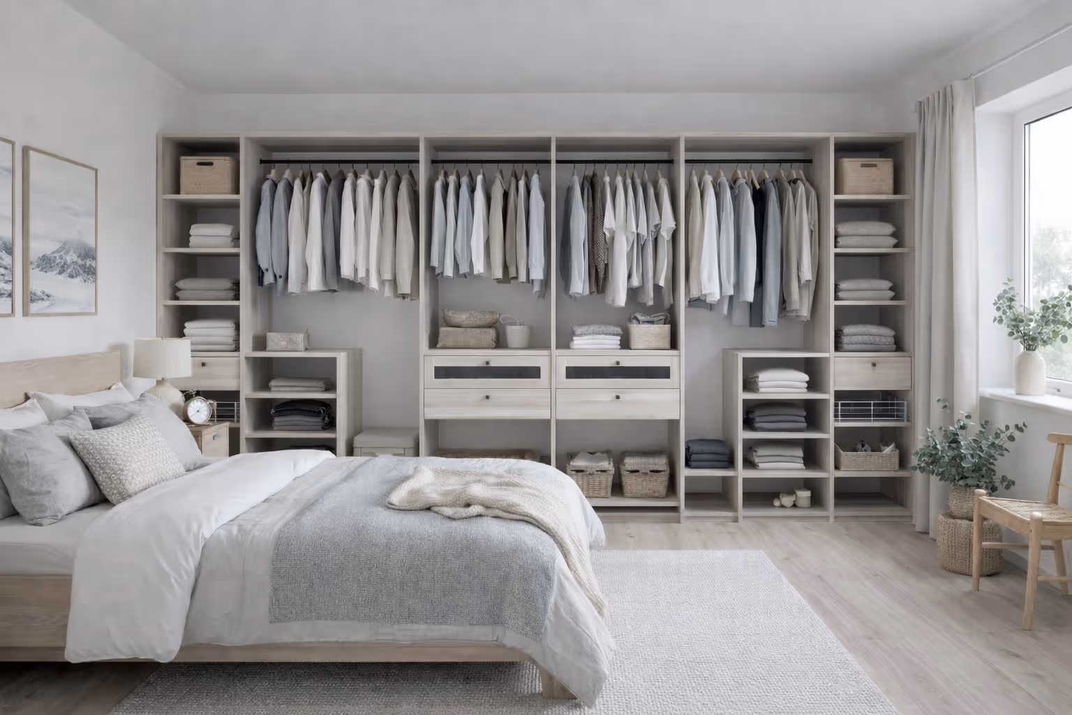 Innredningen i Flexi garderoben kan kombineres etter dine behov, slik at du får en løsning som fungerer i praksis. Du kan velge mellom skuffer, kurver, hyller eller heng, og sette sammen garderoben ut fra hva du trenger mest plass til. Resultatet er en personlig garderobe med god orden, smart oppbevaring og løsninger tilpasset din hverdag.