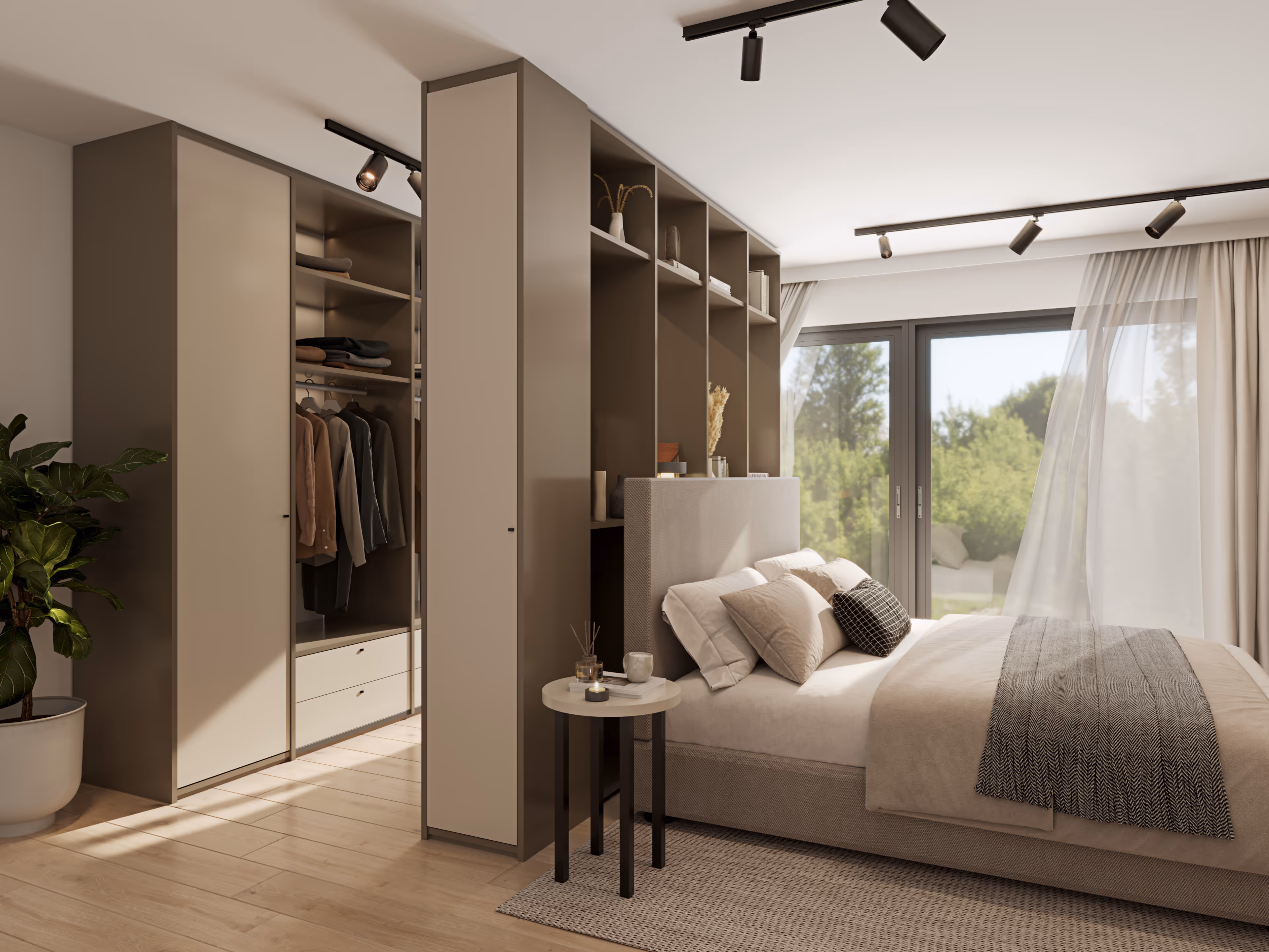 En walk-in garderobe fra Rival kan være åpen, luftig og tilgjengelig, med full oversikt over klær, sko og tilbehør. Ønsker du en mer skjermet eller ryddigere løsning, kan deler av garderoben også kombineres med slagdører eller skyvedører. Det gir deg mulighet til å balansere det åpne og det lukkede, alt etter hvordan du ønsker at rommet skal fungere.